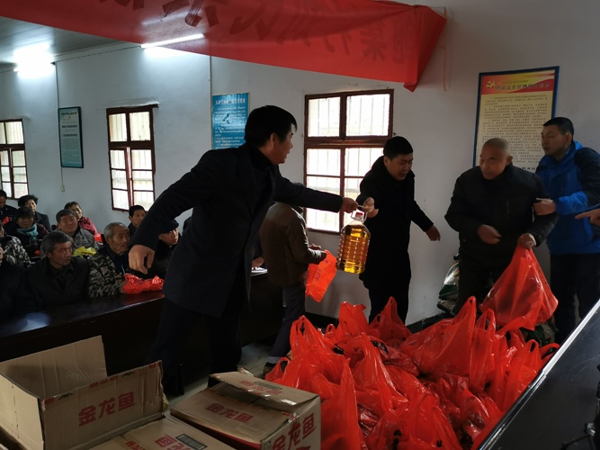 当天上午,企业家们携手为贫困户献上了新鲜的土猪肉、鱼、大米、食用油等春节年礼,折合人民币共计4万余元。