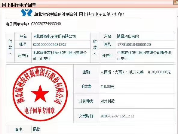 阻击疫情,瑞硕再次行动——有着双重身份的湖北瑞硕电子股份有限公司董事长(东莞随州商会执行会长)刘清伟,于2020年1月27日积极参与了东莞市湖北随州商会发出的紧急倡议,动员开展爱心募捐活动,号召会员企业用实际行动驰援家乡人民,携手共度难关!