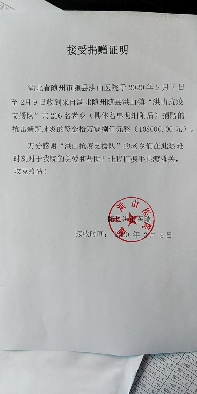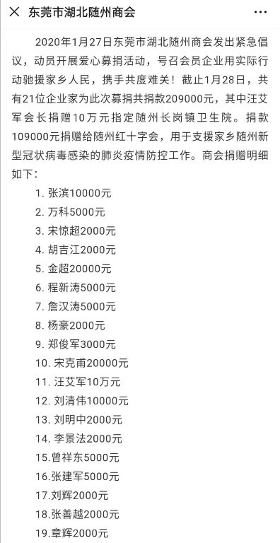 捐款给随州红十字会,用于支援家乡随州新型冠状病毒感染的肺炎疫情防控工作。2月7日,远在千里之外却一直心系家乡的他,得知新型冠状病毒感染的肺炎疫情来势汹汹,且家乡还处在重灾区,疫情医疗防控物资一度出现紧缺,他又在第一时间向家乡医院(随县洪山医院)带头捐款,同时还在网上创建微信群,成立“洪山抗疫支援队”,号召家乡爱心企业人士、公司职工及热心的父老乡亲们为洪山医院捐款捐物。